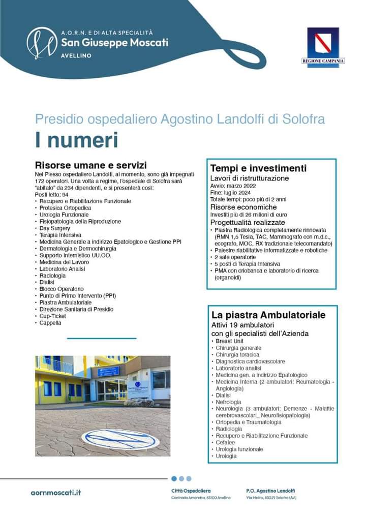 Ieri 30 luglio 2024, รจ stato presentato a Solofra un presidio che ha una sua piena e nuova funzionalitร con posti di rianimazione, riabilitazione, servizi per la procreazione medicalmente assistita, medicina legata alle malattie del fegato e dieci posti di ortopedia in elezione.