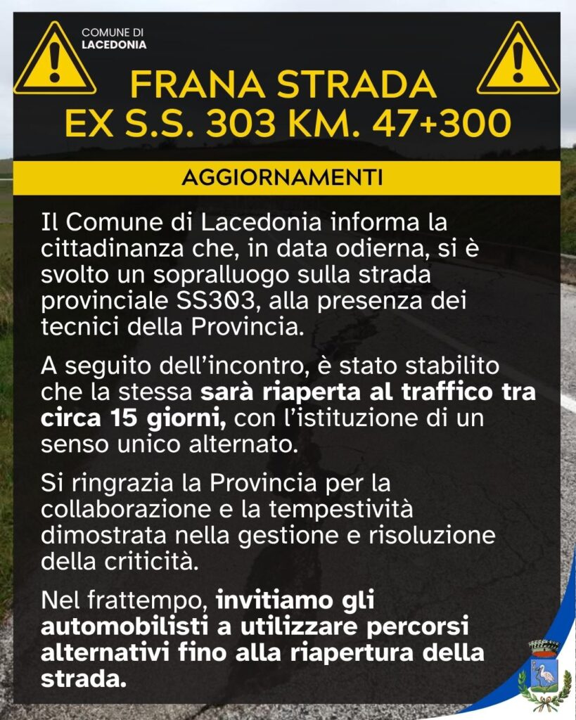 COMUNICAZIONE AI CITTADINI – Aggiornamenti viabilità Ex S.S. 303 Si informa la cittadinanza che in data odierna è stato effettuato un sopralluogo tecnico sulla strada provinciale (km 47+300), attualmente chiusa a causa di una frana. All’incontro hanno partecipato i tecnici della Provincia con i quali è stato definito il piano di ripristino.