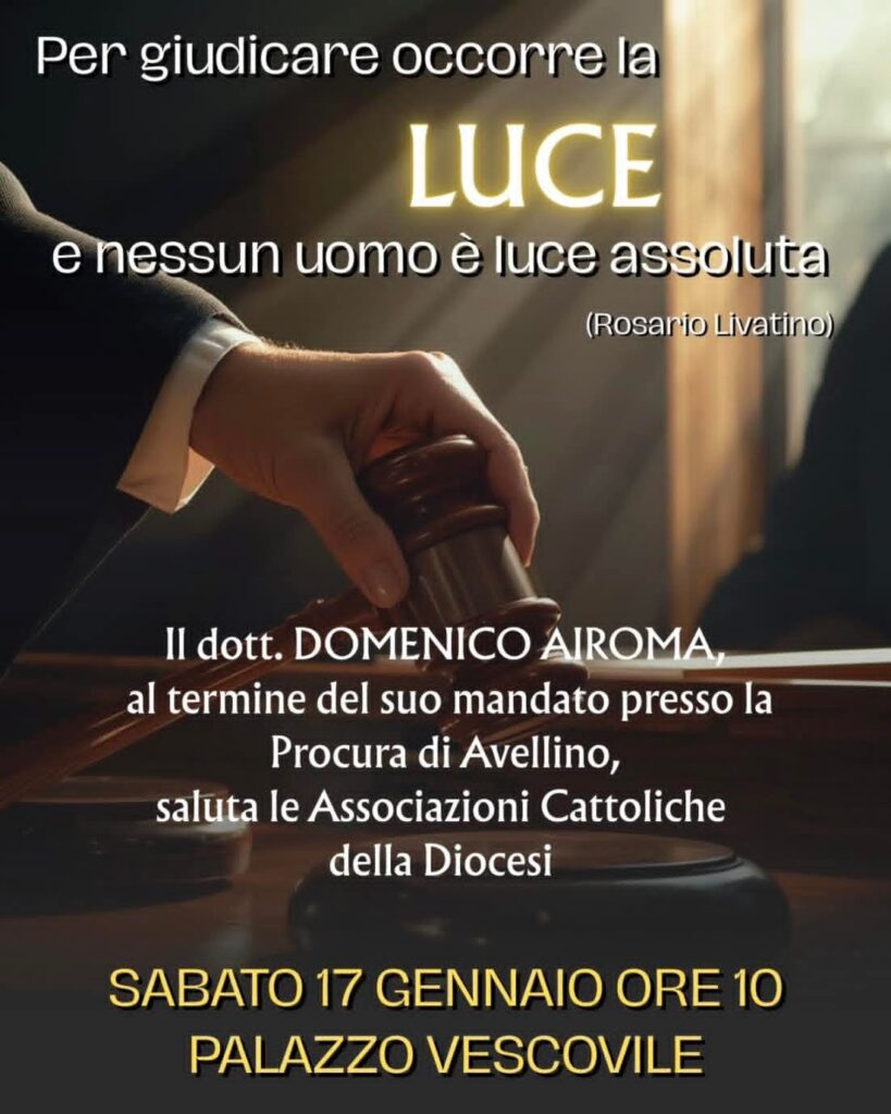 Avellino saluta il dott. Domenico Airoma: un momento di riflessione e gratitudine al termine del mandato – Si terrà sabato 17 gennaio, alle ore 10.00, presso il Palazzo Vescovile di Avellino, un momento di riflessione e di saluto al termine del mandato del dott. Domenico Airoma presso la Procura della Repubblica di Avellino, rivolto in modo particolare alle Associazioni Cattoliche della Diocesi. L’incontro intende essere un’occasione di gratitudine e di dialogo, per ripercorrere il servizio svolto dal dott. Airoma in un territorio complesso, segnato da sfide sociali, educative e morali, e per riflettere sul valore della giustizia come presidio di legalità e di bene comune. Un servizio che, nel corso degli anni, ha saputo coniugare rigore istituzionale, attenzione alla persona e senso di responsabilità verso la comunità. Alla presenza delle realtà associative, del mondo ecclesiale e civile, l’iniziativa si inserisce nel cammino della Chiesa di Avellino, attenta a promuovere una cultura dell’incontro e della corresponsabilità, in sintonia con il percorso sinodale e con il costante richiamo del Vangelo alla giustizia, alla verità e alla pace sociale.