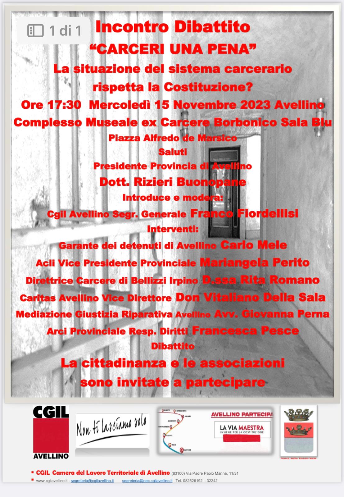 Mentre dalle ore 17:30 la CGIL Avellino con le associazioni aderenti a “La Via Maestra insieme per la Costituzione”si confrontano in un dibattito pubblico su “Carceri una pena. La situazione del sistema carcerario rispetta la Costituzione?”