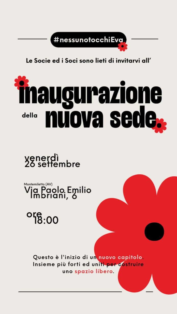 Montemiletto (AV), 23 settembre 2025 – Un nuovo presidio di impegno civile e sociale contro la violenza di genere apre le sue porte nel cuore dell’Irpinia. Giovedì 26 settembre, alle ore 18.00, l’associazione #nessunotocchiEva inaugura ufficialmente la sua nuova sede in via Imbriani 6, Montemiletto, rafforzando così il proprio operato sul territorio.