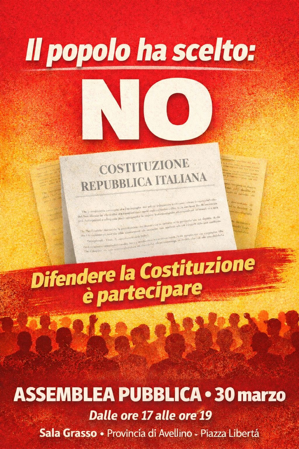 Il risultato netto a favore del NO non consente alcun dubbio sulla volontà popolare di difendere la costituzione repubblicana ed è un monito anche nei confronti di altre riforme ‘in cantiere’ come l’autonomia differenziata o il premierato.Anche nella nostra Regione, nella nostra Provincia e nella Città di Avellino, il grande consenso di popolo rivela una matura coscienza democratica. Consideriamo questo risultato provinciale e cittadino un segnale importante anche per le forze politiche e riteniamo che rappresenti un dato politico di cui tutti dovranno tener conto.Per un incontro con la cittadinanza e la società civile irpina, il Comitato per il NO, insieme agli altri Comitati costituiti in provincia, convoca un’assemblea pubblica per il giorno 30 marzo per una riflessione corale su questo evento così importante e per un saluto e un ringraziamento a tutta la cittadinanza. N.B. L’assemblea Pubblica si svolgerà nella Sala Grasso Palazzo della Provincia lunedi 30 dalle 17 alle 19 • Piazza Libertà • AvellinoSi esprime un sentito ringraziamento alla Provincia di Avellino, nella persona del Presidente, per la concessione gratuita dei locali della Pubblica Amministrazione.