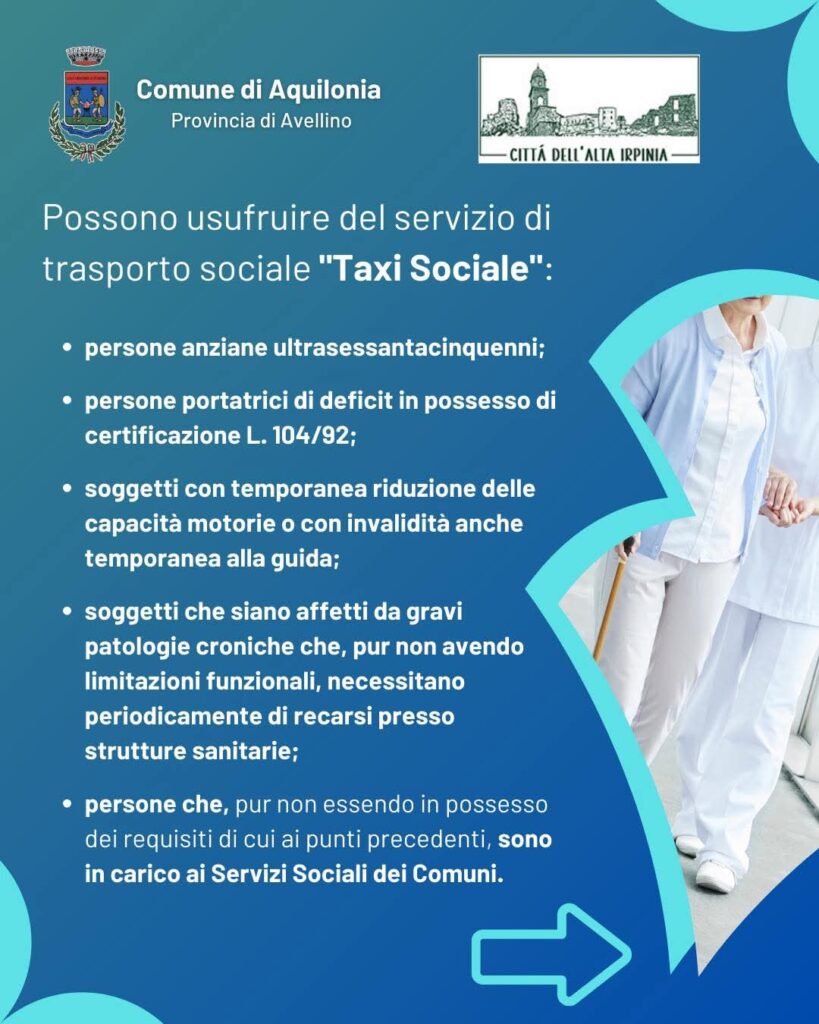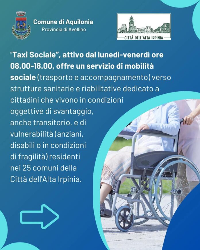 Attivo il servizio di trasporto sociale “Taxi Sociale” per i cittadini dell’Alta Irpinia. È stato pubblicato l’avviso pubblico per l’accesso al servizio di trasporto sociale “Taxi Sociale”, promosso dalla Città dell’Alta Irpinia nell’ambito della programmazione 2021–2027, rivolto ai cittadini residenti nei 25 Comuni del comprensorio, compreso il Comune di Aquilonia.
