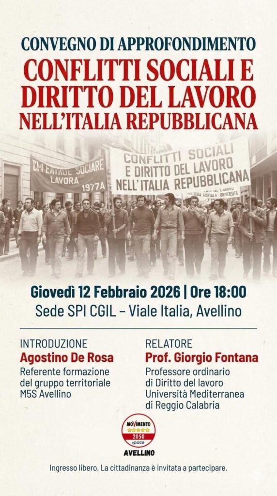 In data 12 febbraio 2026 alle ore 18,00, ad Avellino, presso la sede dello SPI CGIL in viale Italia 40, il Gruppo territoriale di Avellino del Movimento 5 Stelle ha organizzato un incontro pubblico sul tema “CONFLITTI SOCIALI E DIRITTO DEL LAVORO NELL’ITALIA REPUBBLICANA”, con introduzione di Agostino De Rosa, responsabile della Formazione del G.T. del M5S, e relazione di Giorgio Fontana, professore ordinario di Diritto del Lavoro presso l’Università Mediterranea di Reggio Calabria.L’evoluzione del diritto del lavoro traduce in linguaggio e principi giuridici, in maniera abbastanza fedele, i conflitti ed i rapporti di forza tra le classi nella realtà produttiva del nostro paese.