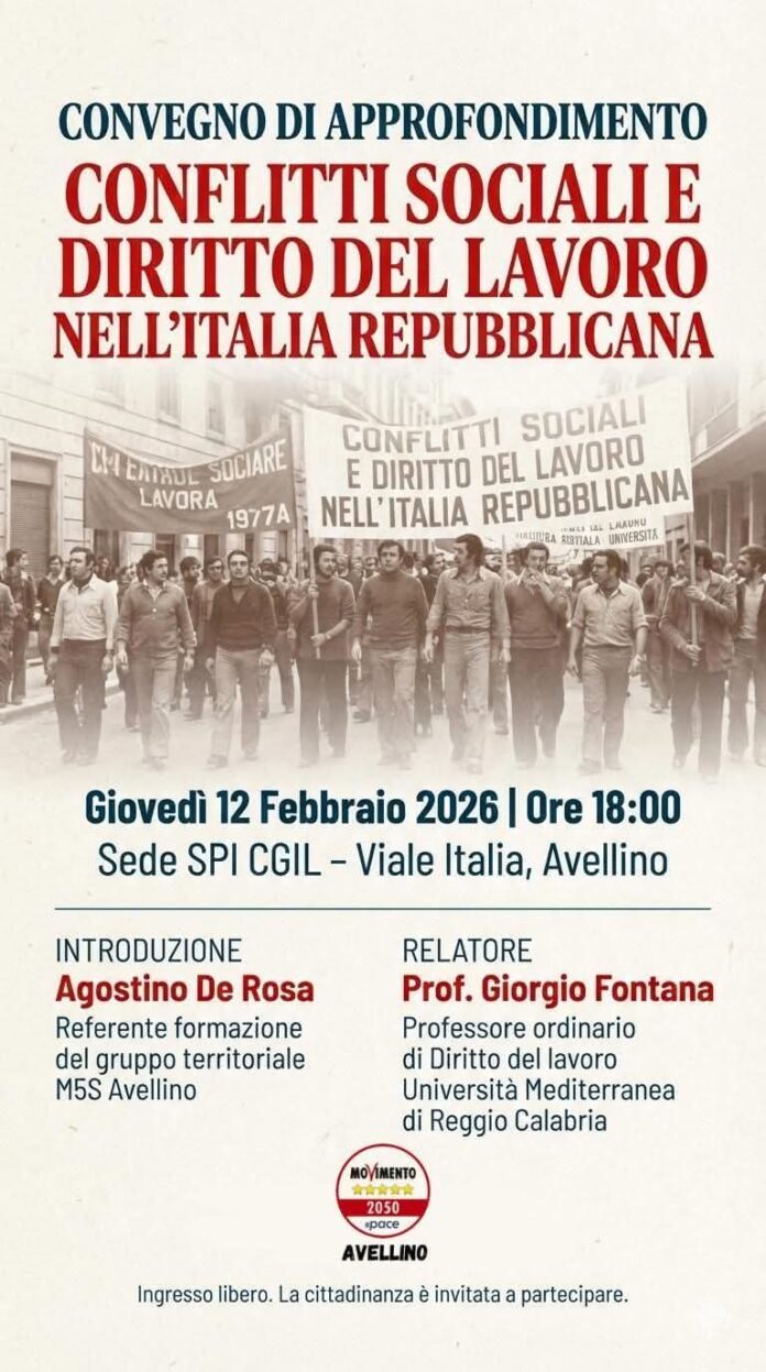 In data 12 febbraio 2026 alle ore 18,00, ad Avellino, presso la sede dello SPI CGIL in viale Italia 40, il Gruppo territoriale di Avellino del Movimento 5 Stelle ha organizzato un incontro pubblico sul tema “CONFLITTI SOCIALI E DIRITTO DEL LAVORO NELL’ITALIA REPUBBLICANA”, con introduzione di Agostino De Rosa, responsabile della Formazione del G.T. del M5S, e relazione di Giorgio Fontana, professore ordinario di Diritto del Lavoro presso l’Università Mediterranea di Reggio Calabria.L’evoluzione del diritto del lavoro traduce in linguaggio e principi giuridici, in maniera abbastanza fedele, i conflitti ed i rapporti di forza tra le classi nella realtà produttiva del nostro paese.