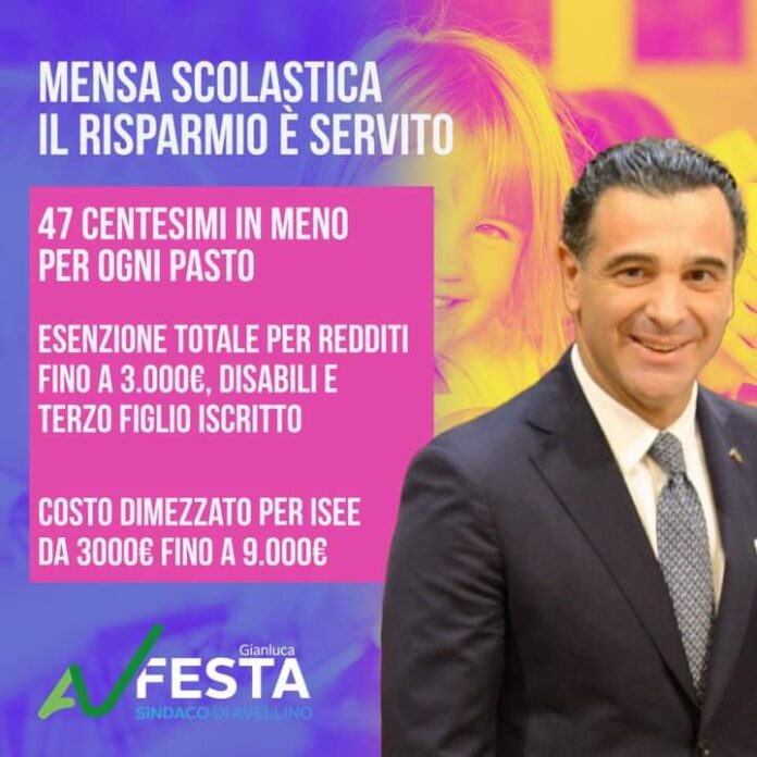 Avellino – “Dal prossimo 8 gennaio il costo della mensa scolastica sarà più basso per tutti: l’avevamo promesso e l’abbiamo fatto – dichiara il primo cittadino Gianluca Festa – abbiamo stabilito l’esenzione totale per le famiglie residenti con un minore a carico in condizione di disabilità. Non si pagherà nulla per il terzo figlio, nei nuclei familiari in cui altri due già usufruiscono della refezione”.