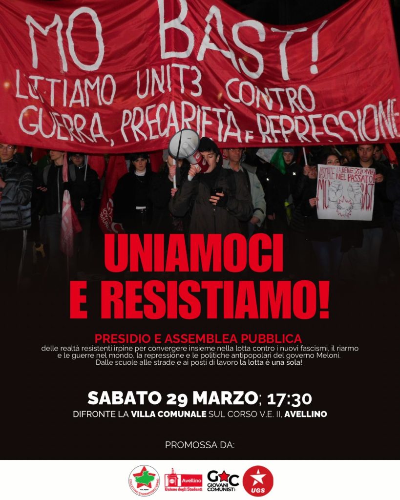 Il Collettivo Studentesco Irpino invita tutte le realtà antifasciste e democratiche a partecipare all’assemblea del 29 marzo. Per discutere collettivamente di questi temi e costruire una rete di resistenza attiva, con l’obiettivo di difendere diritti e libertà.