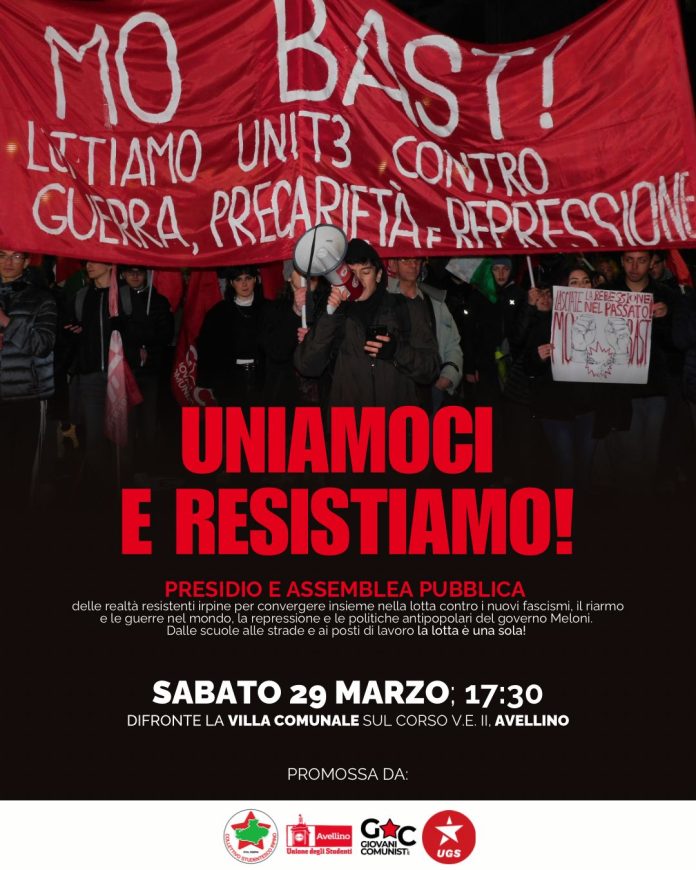 Avellino – Il Collettivo Studentesco Irpino intende lanciare un appello alla cittadinanza, alle associazioni e alle forze politiche democratiche per una mobilitazione pubblica. L’evento è previsto per sabato 29 marzo alle ore 18 presso l’ingresso della Villa Comunale di Avellino. L’obiettivo è quello di aprire un confronto sulle preoccupanti tendenze che, secondo gli studenti del collettivo, stanno minacciando i diritti fondamentali. Lo scopo è anche quello di portare l’attenzione sulla diffusione di ideologie neofasciste nelle scuole, dell’incremento delle spese militari e del ddl 1660.