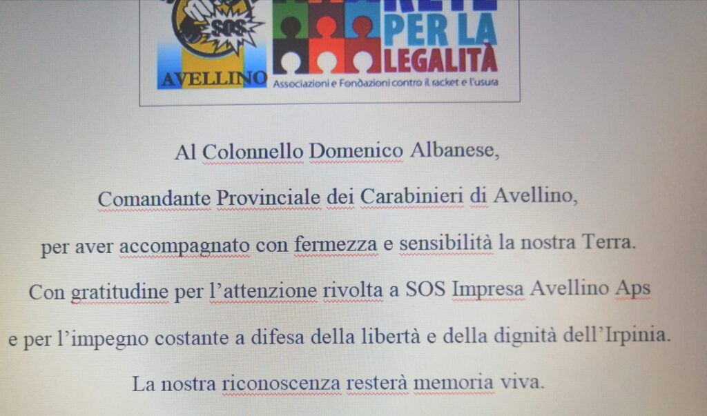 Avellino, 22 agosto 2025 – SOS Impresa Avellino – Rete per la Legalità esprime un sentito ringraziamento al Colonnello Domenico Albanese, che si appresta a concludere il suo incarico alla guida del Comando Provinciale dei Carabinieri di Avellino.