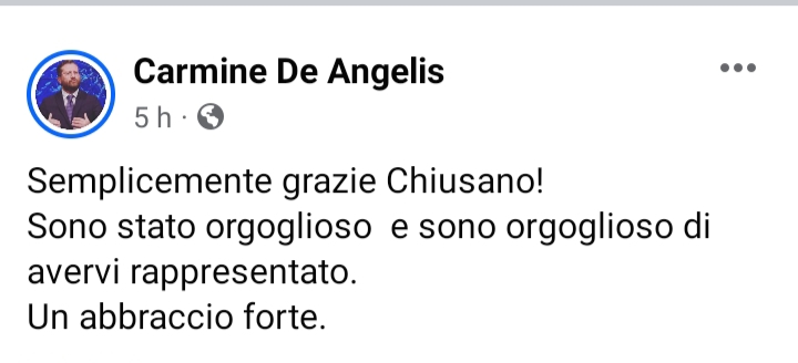 Semplicemente grazie Chiusano! Sono stato orgoglioso e sono orgoglioso di avervi rappresentato. Un abbraccio forte– le parole del sindaco De Angelis –