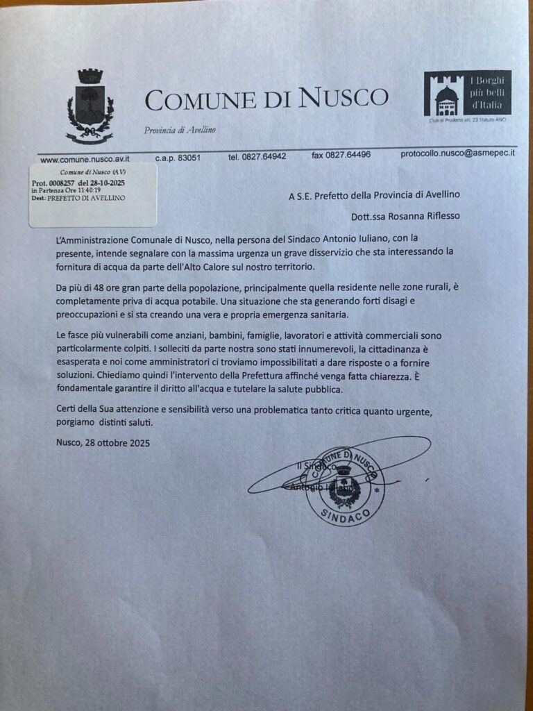 L’Amministrazione comunale, guidata dal sindaco Antonio Iuliano, ha inviato una segnalazione urgente alla Prefettura di Avellino per denunciare il disservizio e chiedere un intervento immediato dell’Alto Calore Servizi, la società che gestisce la rete idrica.