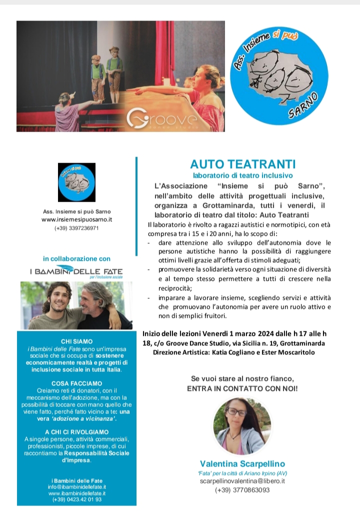 E’ così che nasce Auto Teatranti, laboratorio di teatro inclusivo rivolto a ragazzi autistici e normodotati con età compresa tra i 15 e i 20 anni. Lo scopo è ancora una volta quello di offrire stimoli adeguati allo sviluppo di autonomia dei ragazzi autistici e dare al contempo a tutti i partecipanti un momento di crescita collettiva, così da consentire ai partecipanti l’esperienza della reciprocità, imparando a lavorare insieme con un ruolo attivo importante.