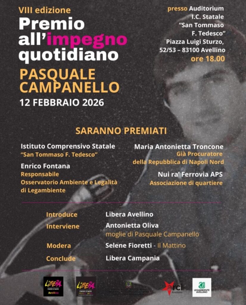 L’esempio che continua a vivere: Premio Pasquale Campanello – VIII Edizione – Il giorno 12 febbraio alle ore 18.00 si terrà l’VIII edizione del “Premio all’impegno quotidiano – Pasquale Campanello”, presso l’Auditorium dell’Istituto Comprensivo “San Tommaso F. Tedesco Piazza 52/53, Avellino.