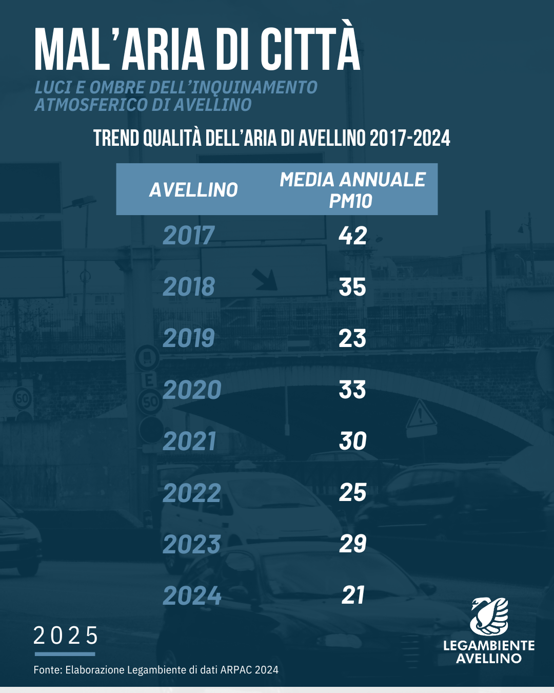 Mal’Aria 2025: Avellino respira meglio, ma la sfida non è ancora vinta – Avellino, 04/02/2024 – Legambiente Avellino presenta il rapporto “Mal’Aria 2025”, un’analisi dell’inquinamento atmosferico elaborata sulla base dei dati ARPAC 2024. I numeri evidenziano un trend incoraggiante nella qualità dell’aria: dal 2017 al 2024, il livello medio annuo è calato significativamente, passando da 42 µg/m³ a 21 µg/m³. Questo risultato avvicina la città agli obiettivi europei di qualità dell’aria da raggiungere entro il 2030, pari a 20 µg/m³.