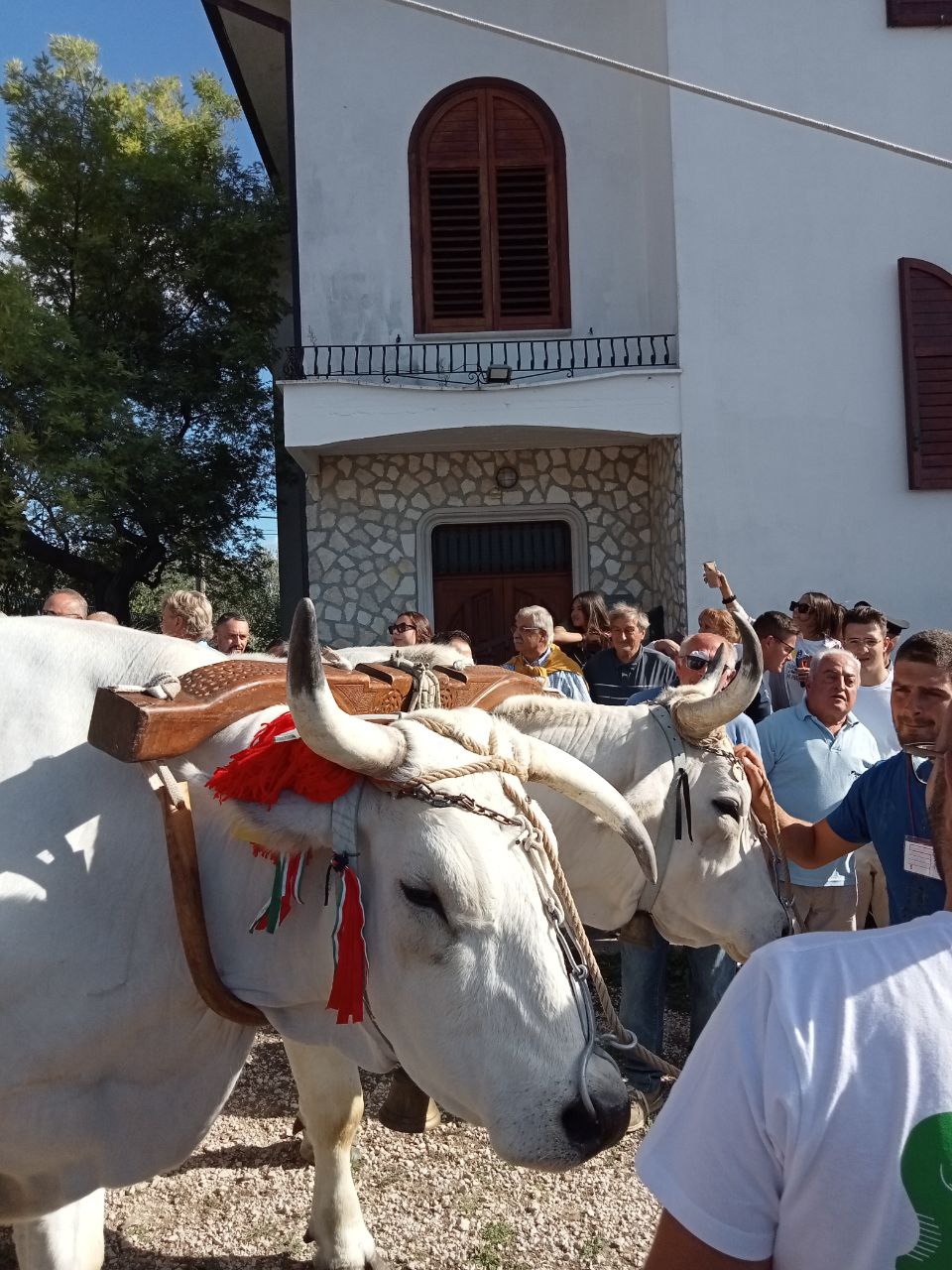Come ogni anno, abbiamo documentato lo strazio a cui questi animali, 12 buoi, sono sottoposti. Oltre lo stress fisico dovuto al peso da trasportare sulle schiene evidentemente provate, abbiamo notato il fortissimo distress psicologico prolungato per oltre quattro ore (!) di manifestazione e dovuto all’impossibilità di rifuggire il contatto con le persone (ricordiamo che, etologicamente, i bovini sono “prede” – ndr) e constatato la reale sofferenza di questi animali. Abbiamo visto e documentato funi tirate che strattonavano i loro corpi, colpi di fune a mo’ di frustate in viso, colpi sul corpo e tanta, tantissima dissonanza cognitiva nei festosi partecipanti.