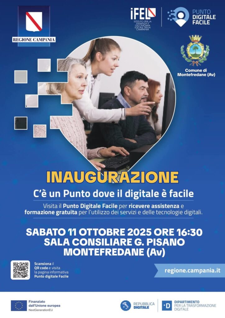 Montefredane – Sabato 11 ottobre alle ore 16:30, presso l’Aula Consiliare “G. Pisano”, sarà inaugurato il Punto Digitale Facile: un nuovo spazio gratuito dove tutti i cittadini potranno ricevere assistenza e formazione per utilizzare al meglio i servizi e gli strumenti digitali.