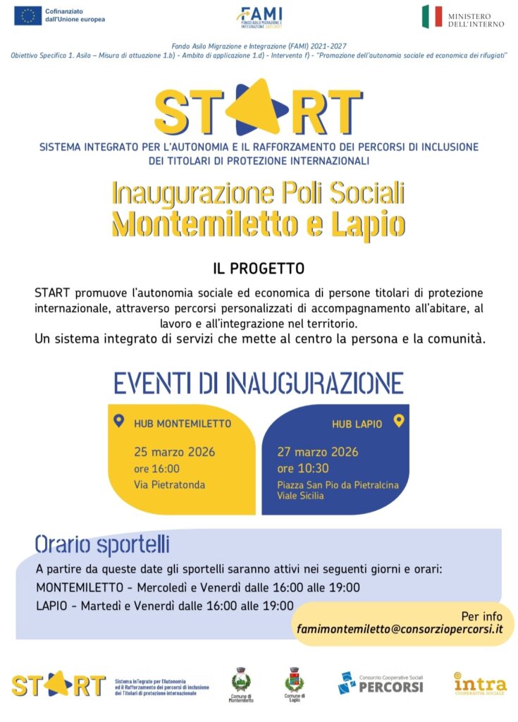 Il progetto, promosso dal Comune di Montemiletto in qualità di capofila, insieme al Comune di Lapio e al partenariato composto da Consorzio Percorsi e Intra Cooperativa Sociale, è rivolto a 50 beneficiari titolari di protezione internazionale e giovani in uscita dai percorsi di accoglienza. Un’iniziativa che punta ad accompagnare queste persone in una fase delicata, quella del passaggio verso l’autonomia, attraverso percorsi personalizzati che mettono insieme lavoro, casa e integrazione nel territorio. Gli hub rappresentano il cuore operativo del progetto: luoghi fisici aperti alla comunità in cui sarà possibile attivare servizi di orientamento, supporto e accompagnamento, con l’obiettivo di costruire percorsi concreti di inclusione sociale ed economica. Un modello che non si limita all’assistenza, ma che prova a rafforzare il legame tra persone e territorio, mettendo in rete istituzioni, servizi e comunità locali. Il primo appuntamento è in programma a Montemiletto, il 25 marzo alle ore 16:00, presso la sede di via Pietratonda. A seguire, il 27 marzo alle ore 10:30, l’inaugurazione dell’hub di Lapio presso Piazza San Pio da Pietralcina in Viale Sicilia. In entrambe le occasioni saranno presenti figure istituzionali e rappresentanti dei soggetti coinvolti nel progetto.A partire da queste date, gli sportelli saranno attivi con orari settimanali: a Montemiletto il mercoledì e il venerdì dalle 16:00 alle 19:00, a Lapio il martedì e il venerdì nella stessa fascia oraria. Gli hub diventeranno così un punto di riferimento stabile per il territorio, offrendo servizi di orientamento e presa in carico integrata.Il progetto START si svilupperà nell’arco di tre anni e si propone di costruire percorsi di autonomia duraturi, trasformando una fase di transizione in un’opportunità concreta di inclusione.