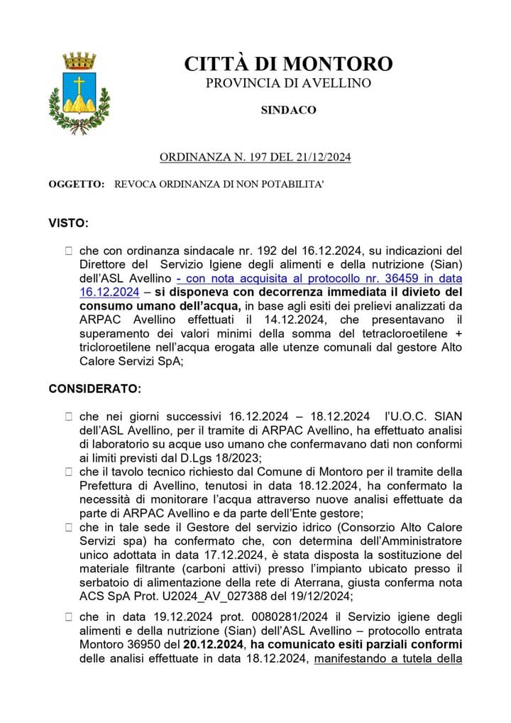 Il sindaco di Montoro ha revocato poco fa l’ordinanza per il divieto di uso acqua potabile, dal suo profilo il video messaggio alla cittadinanza e l’impegno di tenere alta l’attenzione ed il controllo dei dati.