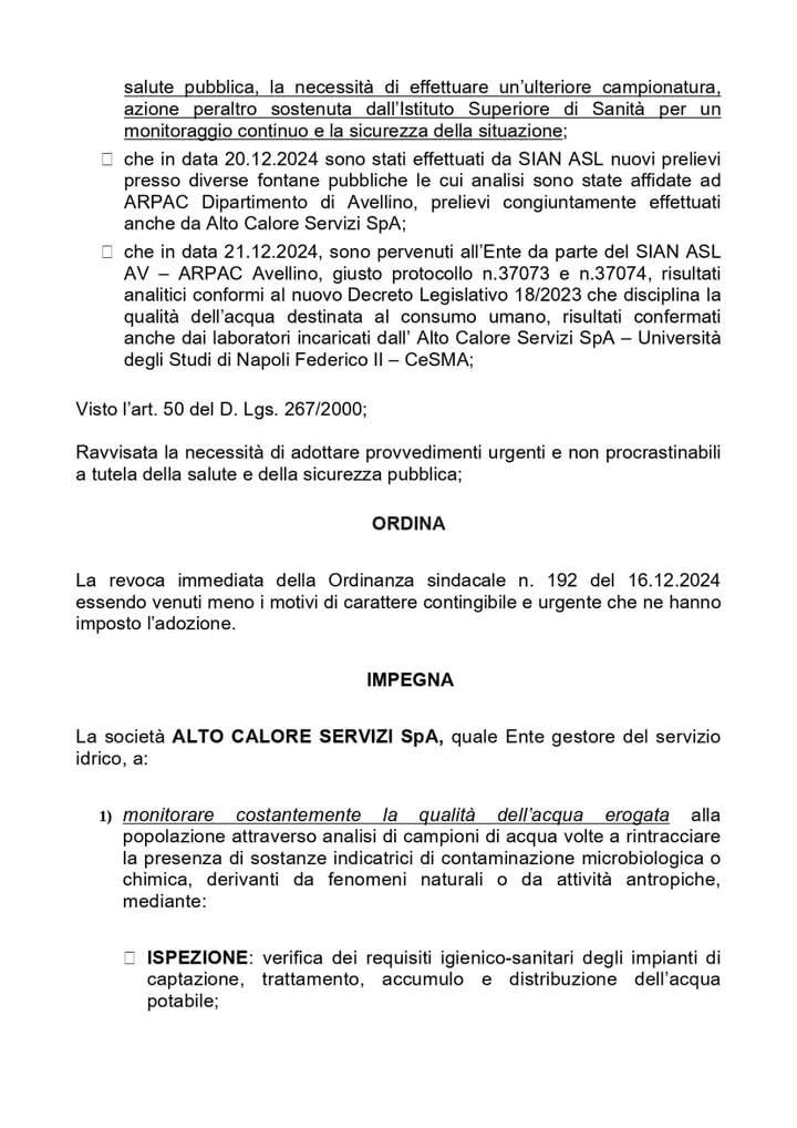 Montoro, Provvedimento di revoca Ordinanza divieto uso acqua potabile.