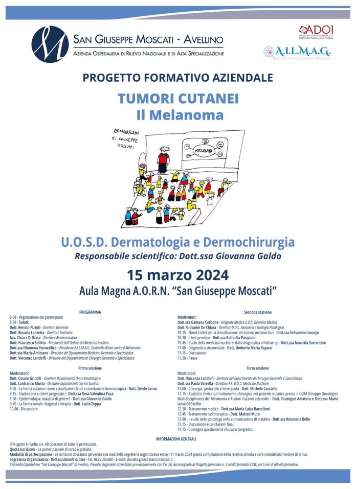 L’evento, organizzato dai professionisti dell’Unità operativa di Dermatologia e Dermochirurgia (responsabile scientifico Giovanna Galdo), sarà introdotto del Direttore generale dell’Azienda Moscati, Renato Pizzuti, dal Direttore sanitario, Renato Lanzetta, e dal Direttore amministrativo, Chiara Di Biase. La Direzione strategica si confronterà al tavolo con il Presidente dell’Ordine dei Medici della provincia di Avellino, Francesco Sellitto, e con il Presidente dell’Associazione Italiana Lotta al Melanoma “Amici di Gabriella Pomposelli” (Ailmag), Filomena Pennasilico, per individuare percorsi operativi finalizzati a ottimizzare le risorse e a favorire una presa in carico multidisciplinare dei pazienti che presentano il tumore cutaneo, avvalendosi dei dati dell’Ordine dei Medici per integrare la casistica clinica e condividere esperienze.