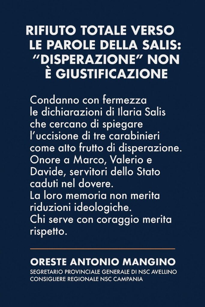 La Segreteria Provinciale del Nuovo Sindacato Carabinieri di Avellino e il Consigliere Regionale NSC Campania, Oreste Antonio Mangino, intervengono con fermezza in merito alle dichiarazioni di Ilaria Salis sulla strage di Castel d’Azzano. Un messaggio chiaro in difesa dell’onore e della memoria dei carabinieri caduti