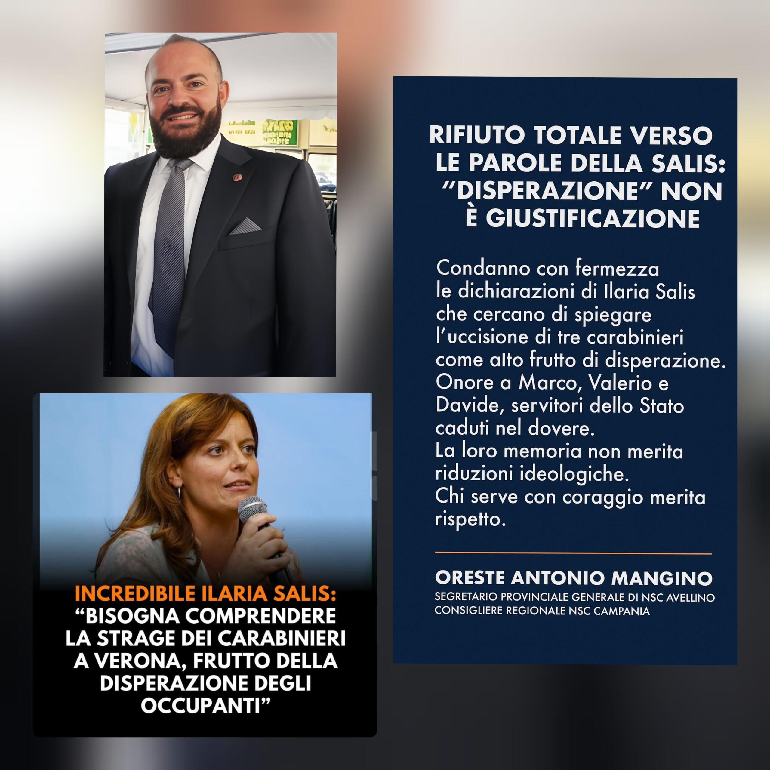 La Segreteria Provinciale del Nuovo Sindacato Carabinieri di Avellino e il Consigliere Regionale NSC Campania, Oreste Antonio Mangino, esprimono sgomento per le dichiarazioni della Signora Ilaria Salis che attribuiscono la strage di Castel d’Azzano alla “disperazione”. Affermazioni che offendono la memoria dei caduti e minano il rispetto verso chi serve in divisa.