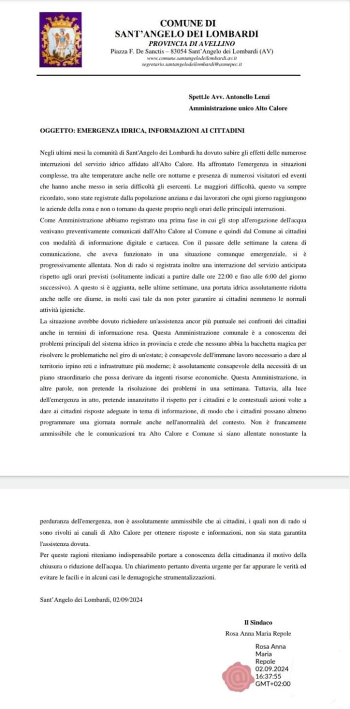 ammissibile che le comunicazioni tra Alto Calore e Comune si siano allentate nonostante la perduranza dell’emergenza, non è assolutamente ammissibile che ai cittadini, i quali non di rado si sono rivolti ai canali di Alto Calore per ottenere risposte e informazioni, non sia stata garantita