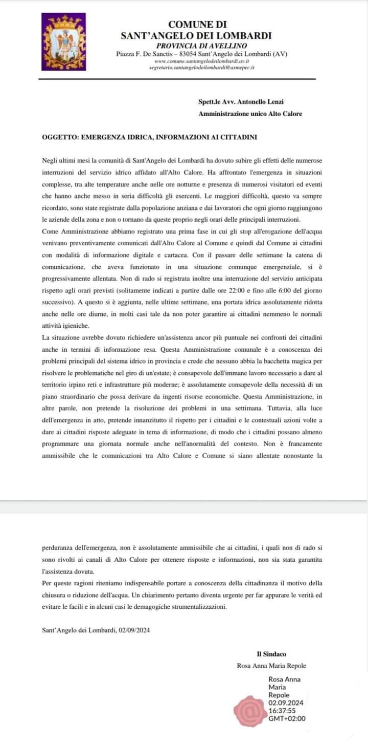 Negli ultimi mesi la comunità di Sant’Angelo dei Lombardi ha dovuto subire gli effetti delle numerose interruzioni del servizio idrico affidato all’Alto Calore. Ha affrontato l’emergenza in situazioni complesse, tra alte temperature anche nelle ore notturne e presenza di numerosi visitatori ed eventi che hanno anche messo in seria difficoltà gli esercenti. Le maggiori difficoltà, questo va sempre ricordato, sono state registrate dalla popolazione anziana e dai lavoratori che ogni giorno raggiungono le aziende della zona e non o tornano da queste proprio negli orari delle principali interruzioni.