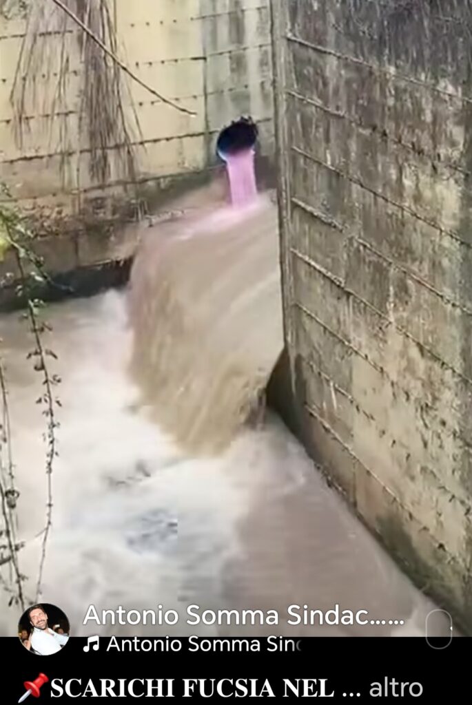 I liquidi ripresi nel filmato presentano una colorazione anomala rosa-fucsia, accompagnata da odori sgradevoli, schiume persistenti e sostanze oleose in superficie, elementi che fanno ipotizzare la presenza di vernici o miscele contenenti solventi e composti chimici potenzialmente pericolosi per l’ambiente acquatico. Secondo quanto emerso, non si tratterebbe di un episodio isolato.