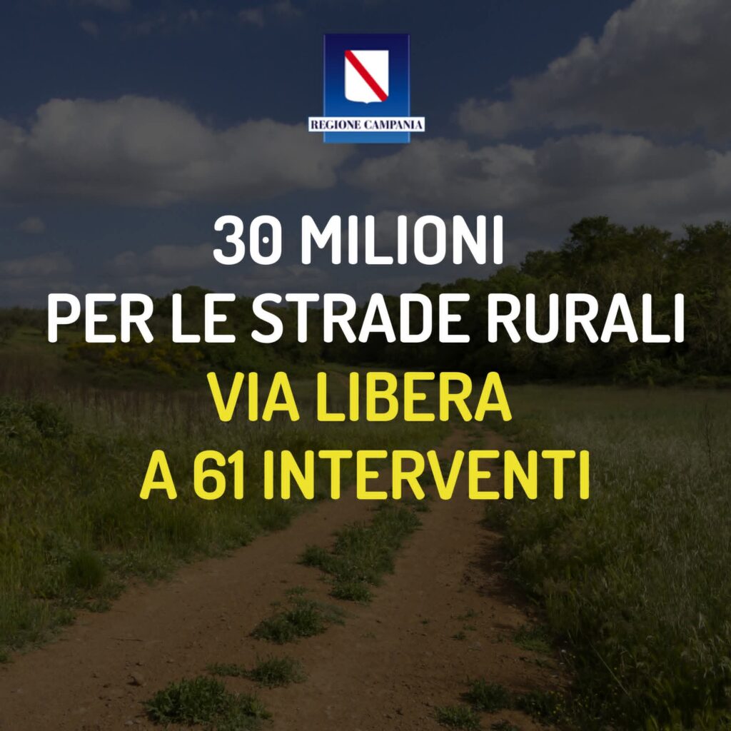 Strade rurali, 30 milioni ai Comuni: via libera a 60 interventi in Campania – La Regione Campania ha pubblicato la graduatoria del bando “Reti viarie al servizio delle aree rurali”, nell’ambito del CSR 2023-2027, destinando circa 30 milioni di euro al miglioramento della viabilità locale. Sono 60 gli interventi finanziati, che coinvolgono altrettanti Comuni su tutto il territorio regionale.