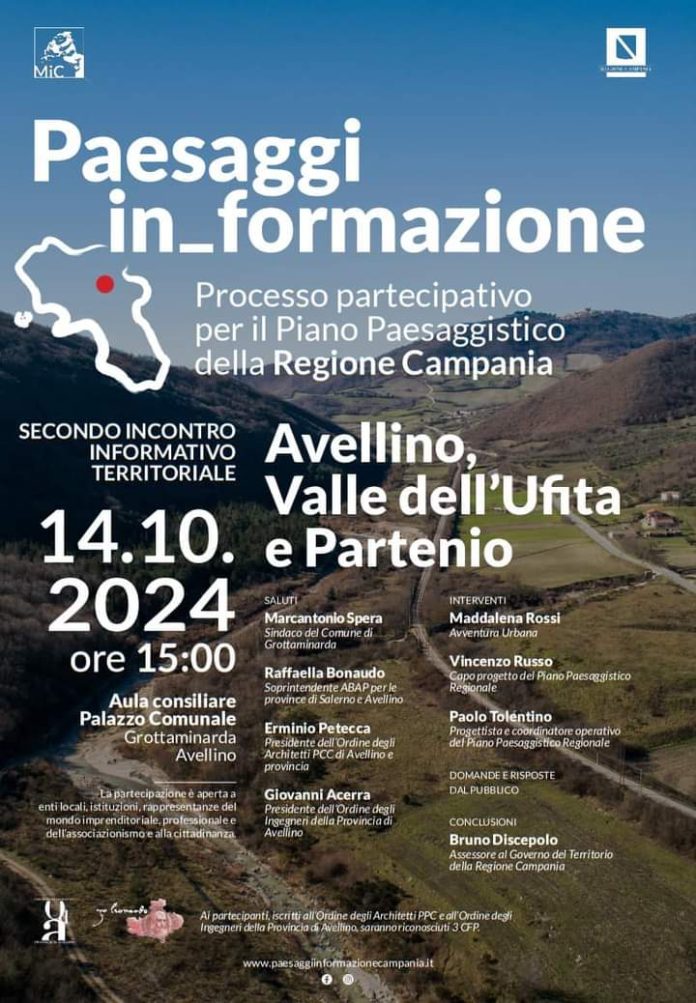 VERSO IL MASTERPLAN – Si terrà a Grottaminarda e sarà dedicato al territorio di Avellino, della Valle dell’Ufita e del Partenio, il secondo incontro informativo territoriale del Processo partecipativo per il Piano Paesaggistico della Regione Campania.