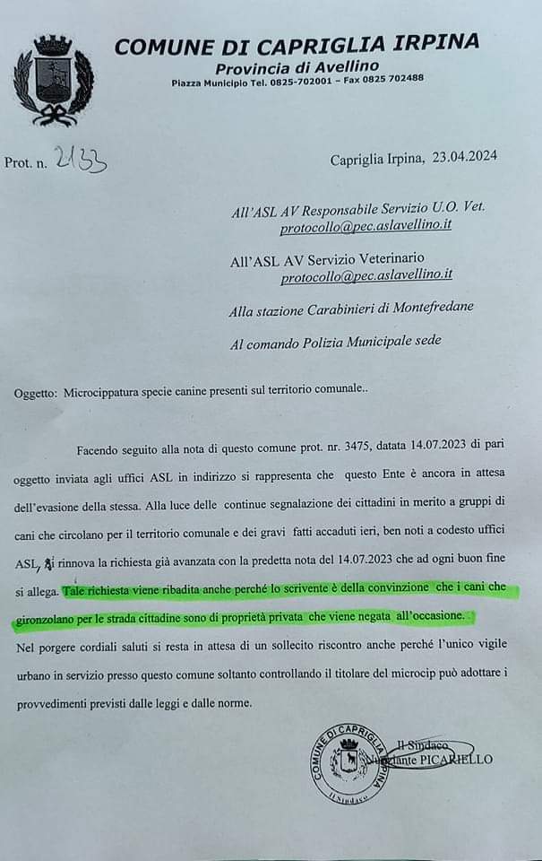 Dopo il tragico evento, il sindaco Nunziante Picariello ha fatto presente ed inviato una lettera nella giornata di oggi 23/04/24 all’ASL, per prendere seri provvedimenti, con la richiesta in oggetto di microcippare le specie canine presenti sul territorio comunale.