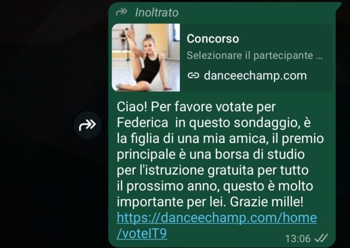 Nuova truffa su WhatsApp: così i criminali svuotano i conti con un finto concorso online – Una nuova truffa sta circolando su WhatsApp e rischia di colpire migliaia di utenti in tutta Italia. Si tratta di un raggiro tanto semplice quanto insidioso: tutto inizia con un messaggio inviato da un contatto reale, come un amico, un parente o un conoscente.Nel testo si chiede di votare una bambina o una giovane ballerina impegnata in un presunto concorso online.
