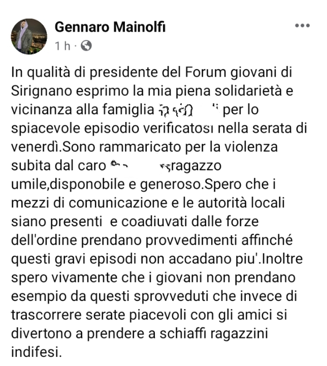 Le parole del presidente Forum giovani di Sirignano (Av) G.Mainolfi: “In qualità di presidente del Forum giovani di Sirignano esprimo la mia piena solidarietà e vicinanza alla famiglia per lo spiacevole episodio verificatosi nella serata di venerdì. Sono rammaricato per la violenza subita dal caro ragazzo umile, disponibile e generoso. Spero che i mezzi di comunicazione e le autorità locali siano presenti e coadiuvati dalle forze dell’ordine prendano provvedimenti affinché questi gravi episodi non accadano piu’.Inoltre spero vivamente che i giovani non prendano esempio da questi sprovveduti che invece di trascorrere serate piacevoli con gli amici si divertono a prendere a schiaffi ragazzini indifesi“.
