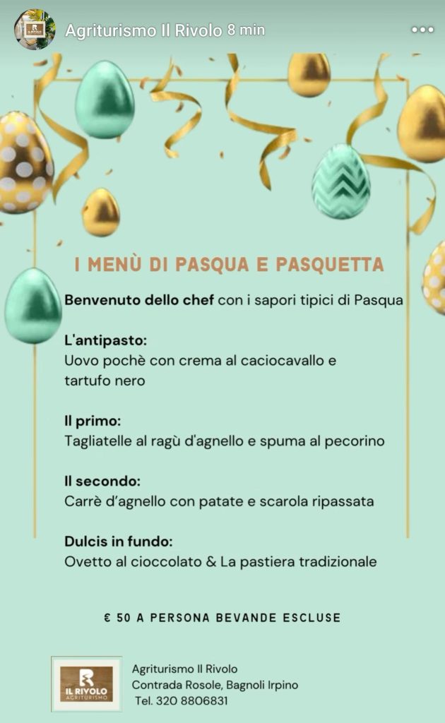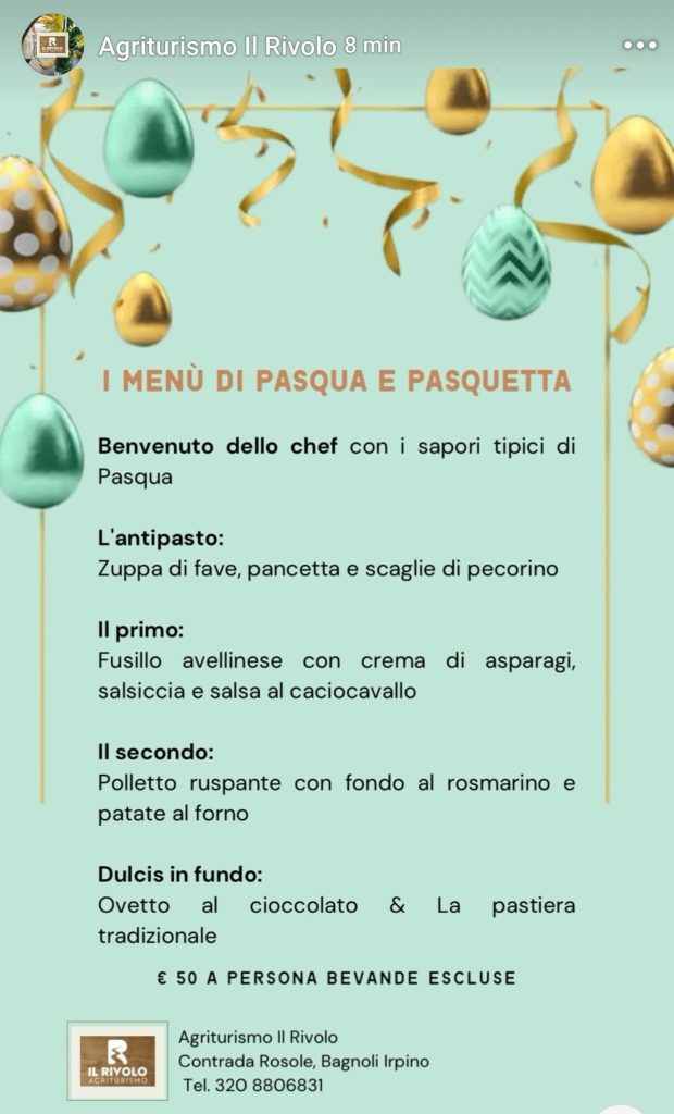 Menù di Pasqua e Pasquetta tutti da gustare dedicati a queste festività. Vi ricordiamo di riservare il vostro tavolo contattando l’Agriturismo “Il Rivolo” di Bagnoli Irpino anche sui canali social Facebook e Instagram, oppure cercarli su Google “Agriturismo il Rivolo contrada Rosole Bagnoli Irpino”.