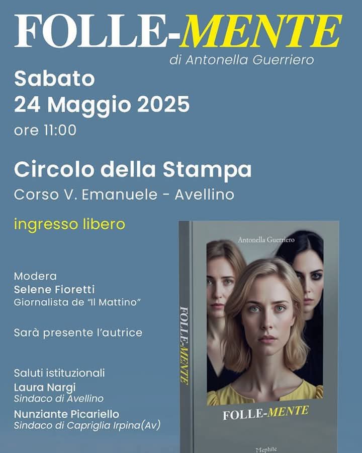 Sabato 24 maggio 2025, alle ore 11:00, presso il Circolo della Stampa di Avellino, si terrà la presentazione del nuovo libro di Antonella Guerriero, “FOLLE-MENTE”.