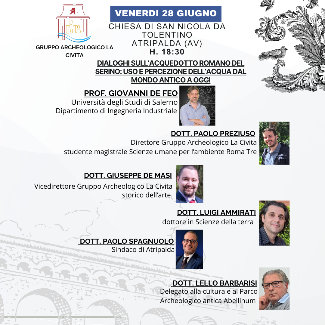 Atripalda – Venerdì 28 giugno 2024 alle ore 18:30 nella chiesa di San Nicola da Tolentino avrà luogo un convegno finalizzato a creare un dibattito sulla percezione e sull’uso dell’acqua dal mondo antico a oggi: l’evoluzione umana, sia biologica che culturale, è profondamente legata all’acqua la cui presenza in un luogo piuttosto che in un altro è alla base della scelta stanziale dell’Homo sapiens.  Tra gli ospiti del Gruppo Archeologico ci sono il professore Giovanni De Feo del dipartimento di Ingegneria Industriale dell’Università di Salerno e il dottore in Scienze della Terra Luigi Ammirati i quali dialogheranno con il dott. Paolo Preziuso, direttore del Gruppo Archeologico La Civita e studente di Scienze Umane per l’ambiente di Roma Tre e il dott. Giuseppe De Masi, storico dell’arte e vicedirettore del Gruppo Archeologico La Civita. Presenti per i saluti istituzionali il Sindaco di Atripalda Paolo Spagnuolo e il delegato alla cultura e al parco archeologico antica Abellinum Lello Barbarisi.