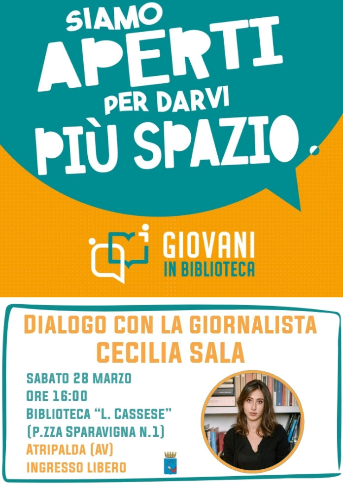 Dialogo con Cecilia Sala – Sabato 28 marzo, dalle ore 16:00, presso la Biblioteca Comunale “L. Cassese” di Atripalda, Cecilia Sala presenterà il suo ultimo volume “I figli dell’odio”. Classe 1995, Sala è autrice di reportage dall’estero, in particolare nei Paesi dell’America Latina e in Medio Oriente. Nel 2020 pubblica il podcast “Polvere”, contro inchiesta in otto puntate sul caso dell’omicidio di Marta Russo. In pochi mesi, complice il successo del podcast, l’inchiesta diviene un libro. Nel 2021 è inviata a Kabul e racconta la caduta dell’Afghanistan in mano ai talebani. Nel 2022 è la prima inviata italiana in Ucraina e racconta ogni giorno attraverso il podcast “Stories” di Chora Media la vita sotto le bombe e nel 2023 pubblica il reportage “L’incendio”.