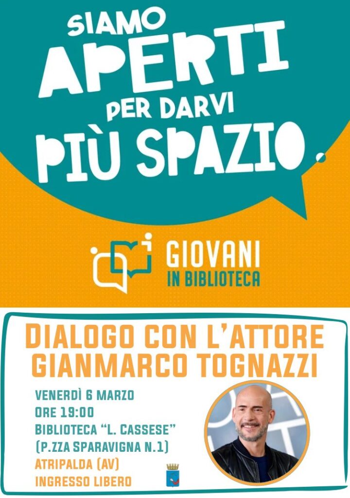 Il Comune di Atripalda è lieto di annunciare un nuovo e prestigioso appuntamento culturale nell’ambito del progetto ministeriale “Giovani in Biblioteca”, un’iniziativa che mira a rendere i luoghi della cultura spazi vivi, aperti e di confronto intergenerazionale. Venerdì 6 marzo, alle ore 19:00, la Biblioteca Comunale “L. Cassese” (Piazza Sparavigna n.1) ospiterà il celebre attore Gianmarco Tognazzi per un incontro aperto a tutto il pubblico. La serata, pensata per abbattere le distanze tra palcoscenico e platea, sarà strutturata come un vero e proprio salotto culturale. A condurre il dialogo sarà Paolo Spagnuolo, giornalista, saggista e profondo appassionato di cinema, che guiderà il pubblico in un viaggio esclusivo attraverso l’esperienza professionale, artistica e umana dell’attore. Figlio d’arte e volto amatissimo dal pubblico, Gianmarco Tognazzi ha segnato con il suo talento decenni di cinema, teatro e televisione in Italia. Nel corso della chiacchierata ci sarà spazio per ripercorrere la sua brillante carriera e le sue memorabili interpretazioni, che spaziano dalla commedia al filone drammatico. Tra le sue numerose pellicole di successo, ricordiamo titoli iconici come “I laureati” di Leonardo Pieraccioni, “Teste rasate” di Claudio Fragasso, “A casa tutti bene” di Gabriele Muccino, fino ad arrivare alla fortunata saga comica iniziata con “Non ci resta che il crimine” di Massimiliano Bruno.