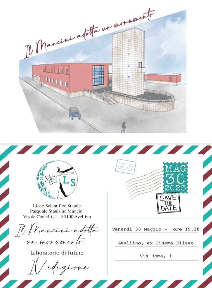 Venerdì 30 maggio, alle ore 19.30, presso l’ ex Cinema Eliseo, gli alunni del Liceo Scientifico Statale “P.S. Mancini” di Avellino presenteranno alla città, in varie forme e secondo linguaggi culturali diversi, il risultato del loro lavoro legato alla quarta edizione del progetto “Il Mancini adotta un monumento: laboratorio di futuro”. La serata prenderà il via dopo i saluti istituzionali della D.S., prof. Anna Paola Gianfelice, del Dirigente dell’Ambito Territoriale di Avellino, dott.ssa Fiorella Pagliuca, del Sindaco della città, dott.ssa Laura Nargi, del Questore, dott. Pasquale Picone, seguiti dall’intervento autorevole del prof. Massimo Visone, docente dell’Università degli Studi di Napoli “Federico II”.