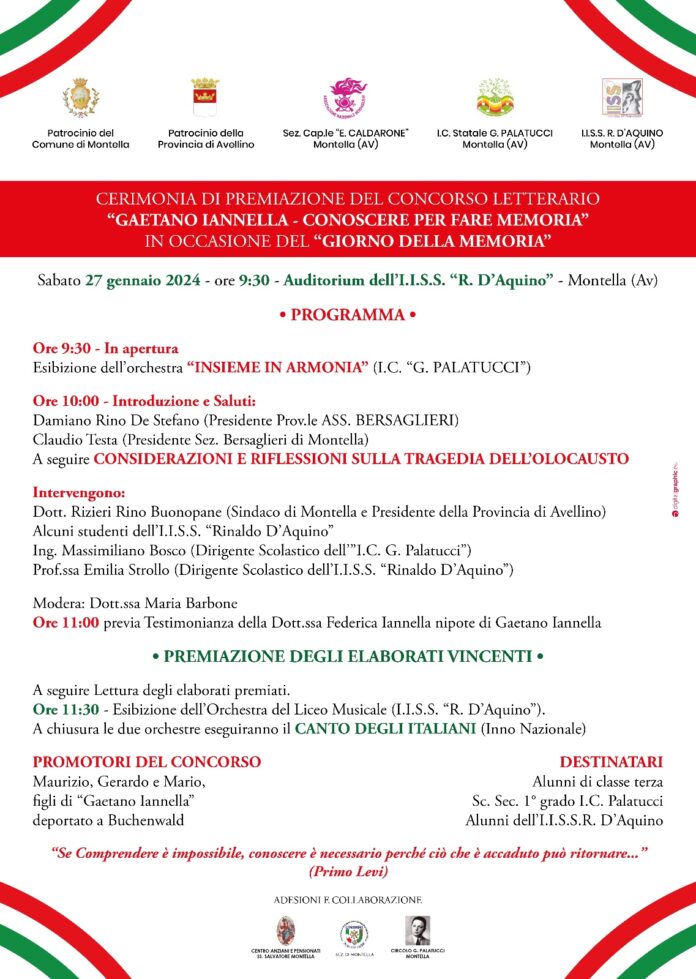 In occasione del dovuto ricordo del Giorno della Memoria, l’Associazione Nazionale Bersaglieri-Sez.Cap.le ”E.Caldarone” di Montella, in collaborazione con l’I.C. ”G.Palatucci” e l’I.I.S.S. ”R.D’Aquino” annuncia la Cerimonia di Premiazione del Concorso Letterario ”Gaetano Iannella-Conoscere per Fare Memoria”.
