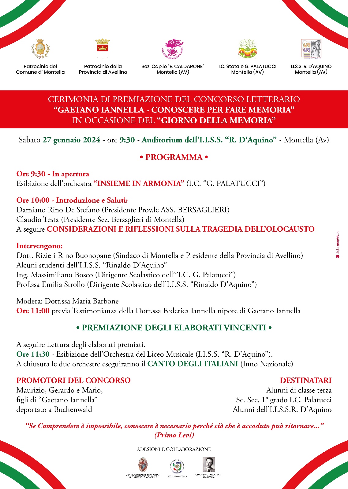 Con il Patrocinio della Provincia di Avellino, del Comune di Montella e delle coinvolte Associazioni ed Istituzioni, la manifestazione avrà luogo sabato 27 gennaio a partire dalle ore 09.30 presso l’Auditorium dell’I.I.S.S. ”R.D’Aquino”, ove relazioneranno diverse rappresentanze e testimonianze, tra allietamenti musicali e premiazioni degli elaborati vincenti.