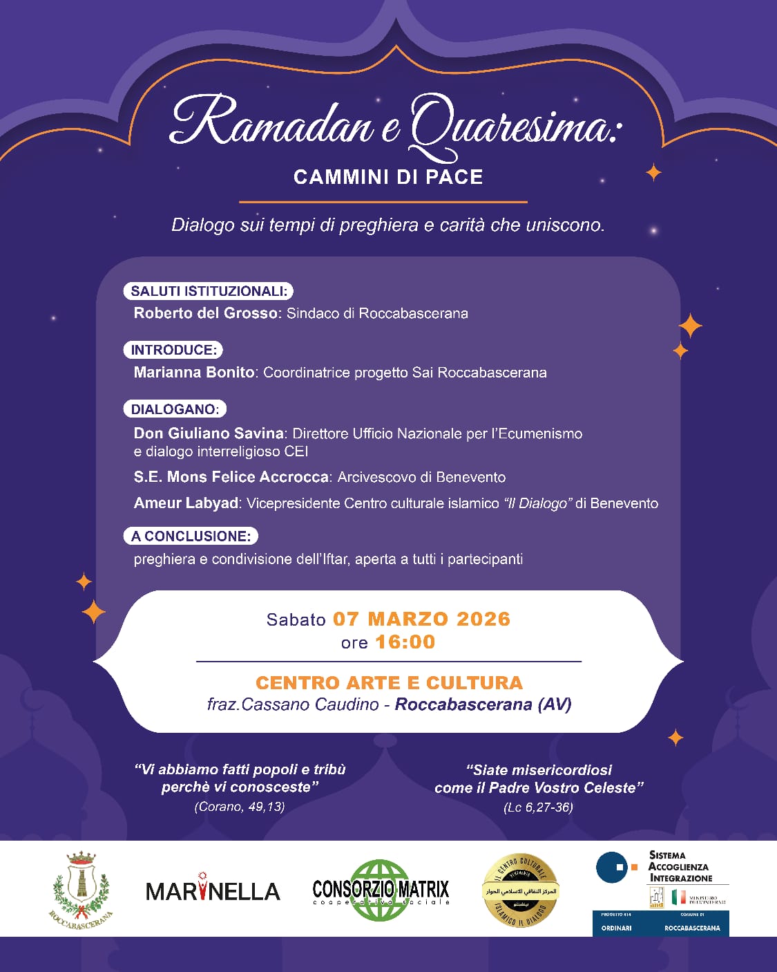 Ramadan e Quaresima: cammini di pace – Presso il centro di arte e cultura di Roccabascerana cultura e religione si intrecciano. L’evento “Ramadan e Quaresima: cammini di pace“, promosso dal progetto Sai di Roccabascerana, vuole rappresentare un momento di Dialogo, integrazione e convivialità sul territorio irpino. Al dialogo, sui tempi di preghiera e carità, prenderanno parte il sindaco di Roccabascerana Roberto del Grosso, modera Don Giuliano Savina, direttore ufficio nazionale per l’ecumenismo e il Dialogo interreligioso della CEI; protagonisti saranno monsignor Felice Accrocca, Arcivescovo di Benevento, e Ameur Labyad, vicepresidente del centro culturale islamico Il Dialogo di Benevento. L’appuntamento è per sabato 7 marzo a Roccabascerana alle 16.00.