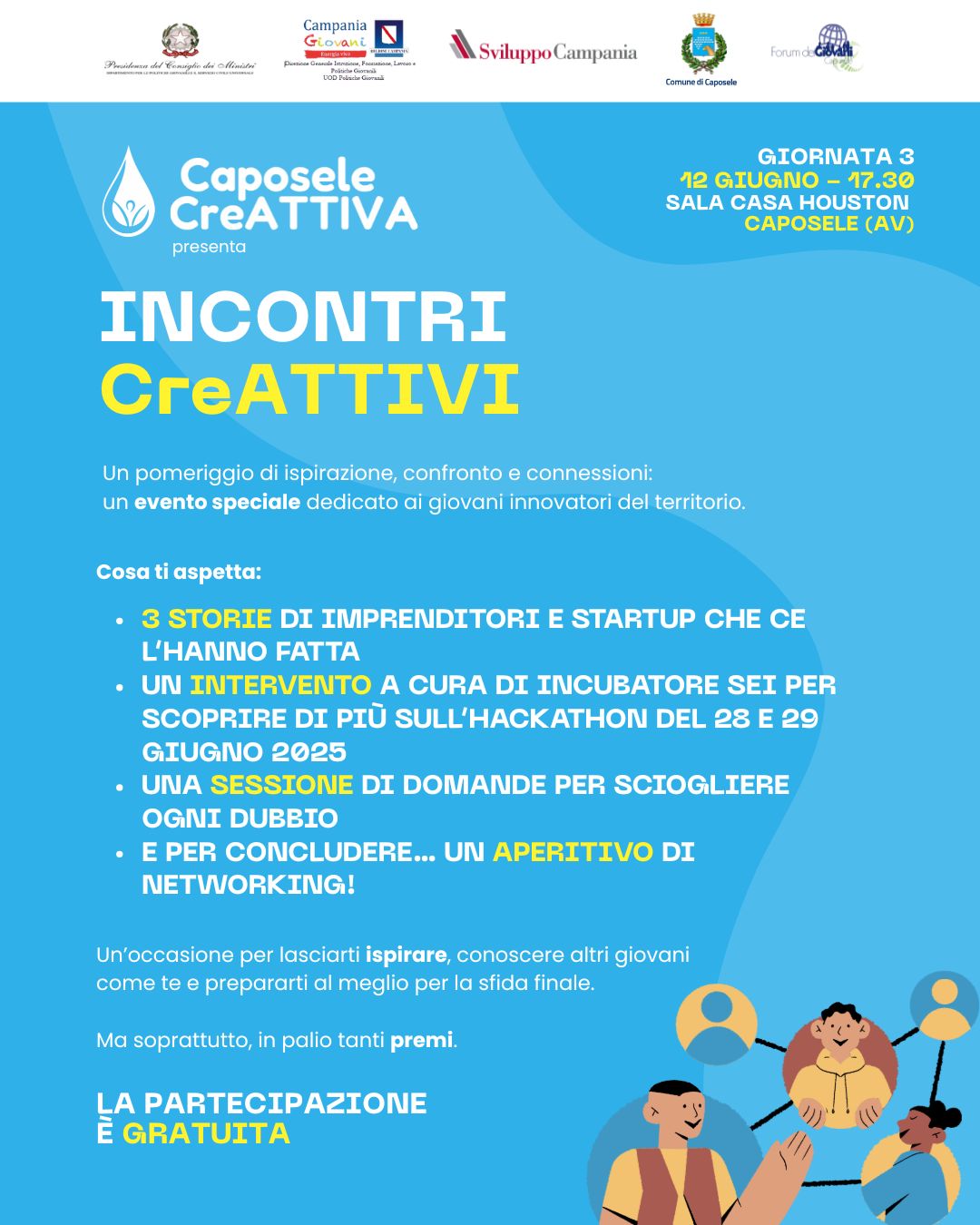 A Caposele arrivano gli “Incontri CreAttivi”: ispirazione, idee e networking in vista dell’Hackathon del 28 e 29 Giugno 2025. Caposele (AV), 09/06/2025 – Nell’ambito del progetto Caposele CreAttiva, il Comune di Caposele – con il sostegno della Regione Campania e del Dipartimento per le Politiche Giovanili e il Servizio Civile Universale, in collaborazione con Incubatore SEI Srl – Società Benefit – presenta un nuovo appuntamento pensato per ispirare e motivare le giovani generazioni. Giovedì 12 giugno alle ore 17:30, presso Casa Houston, si terrà “Incontri CreAttivi”, un evento pubblico aperto a tutti, dedicato al confronto diretto con chi ha trasformato un’idea in un progetto reale.Imprenditori e fondatori di startup racconteranno il proprio percorso, condividendo difficoltà, intuizioni e lezioni apprese con l’obiettivo di offrire ai partecipanti all’Hackathon del 28 e 29 giugno – e a tutti i giovani interessati – spunti concreti, motivazione e fiducia nelle proprie capacità. A seguire, Incubatore SEI illustrerà nel dettaglio le modalità di svolgimento dell’Hackathon, fornendo informazioni pratiche, suggerimenti per affrontarlo al meglio e rispondendo alle domande dei presenti con una sessione di Q&A. La serata si concluderà con un aperitivo di networking, pensato per creare connessioni tra giovani, professionisti, amministratori e realtà del territorio.“Con Incontri CreAttivi e il progetto BarCamp finanziato dalla Regione Campania, vogliamo far capire ai giovani che fare impresa nelle aree interne è possibile facendolo raccontare a chi oggi lo fa già. Come amministrazione comunale stiamo lavorando da anni su questi temi grazie a differenti progetti proprio per offrire non solo ispirazione, ma anche strumenti e relazioni concrete che possano dare sempre più opportunità a tutti ” – commenta Ernesto Donatiello, consigliere comunale con delega alle politiche giovanili – “L’incontro è anche un’occasione per prepararsi all’Hackathon del 28 e 29 Giugno, dove gruppi di ragazzi potranno sfidarsi con nuove idee e immaginare insieme un futuro in cui i giovani restano protagonisti del proprio territorio. Tutti potranno concorrere e vincere premi, nonchè provare a realizzare una propria l’impresa.”L’evento è gratuito e aperto a tutti, con particolare attenzione ai giovani tra i 16 e i 35 anni già iscritti o interessati a partecipare alle attività di Caposele CreAttiva. Per consultare il programma completo e iscriversi al progetto:https://www.comune.caposele.av.it/page/caposele-creattiva-giovani-e-start-up-come-parteciPer ulteriori informazioni puoi scrivere a info@incubatoresei.it o turismo@comune.caposele.av.it.