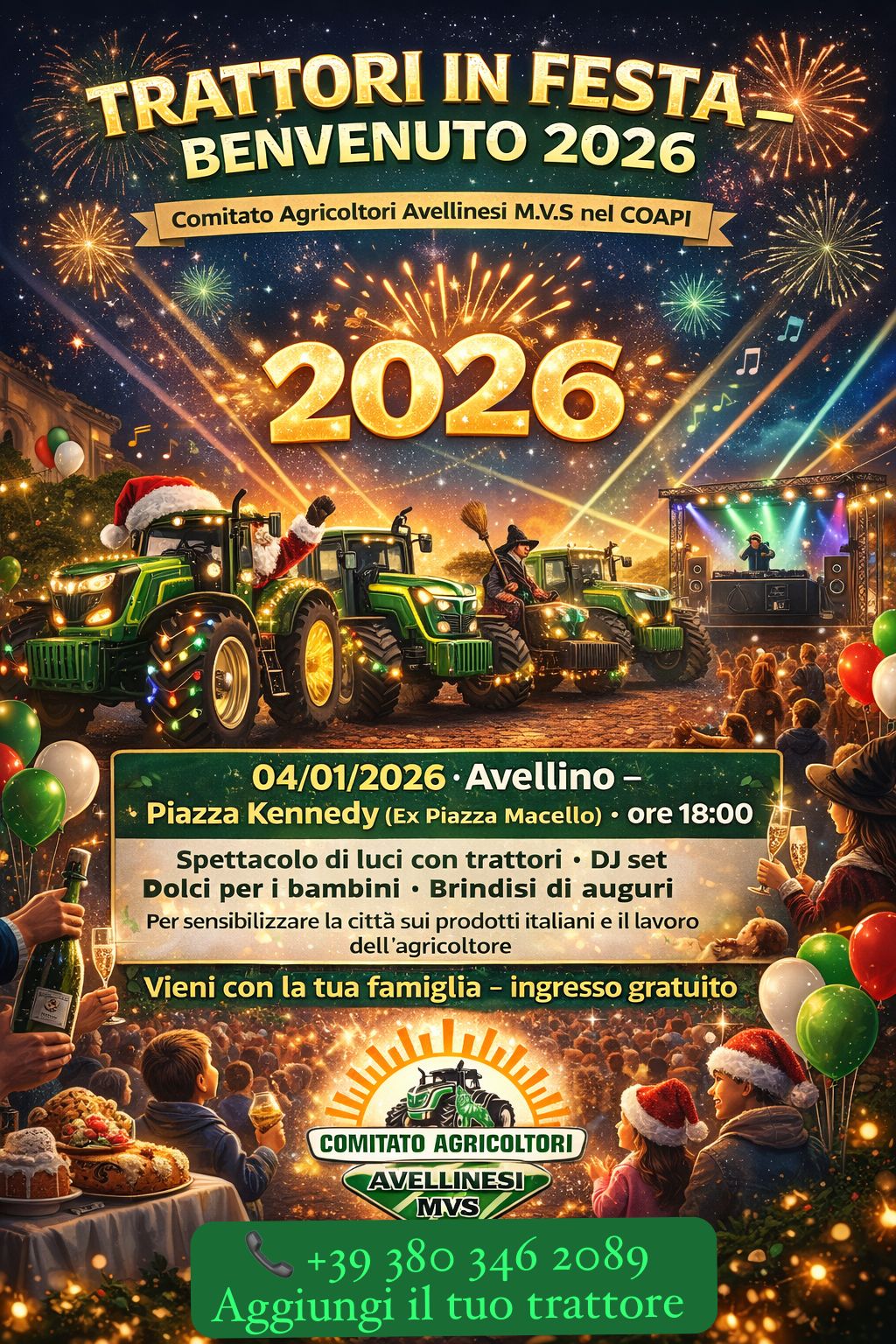 Il Comitato Agricoltori Avellinesi M.V.S., che aderisce al Coordinamento Agricoltori e Pescatori Italiani – #COAPI, organizza una serata speciale in cui i protagonisti saranno i trattori illuminati, simbolo del lavoro agricolo e della vita delle nostre comunità. Attraverso suggestive riprese con drone, i mezzi agricoli formeranno il 2025, che verrà simbolicamente sostituito dal 2026, per salutare insieme il nuovo anno con un messaggio di speranza e partecipazione. La piazza sarà animata da dj set, giochi di luce e musica. Per i più piccoli ci saranno dolci offerti dagli agricoltori, consegnati da Babbo Natale e dalla Befana, per rendere la festa davvero unica e indimenticabile per grandi e piccini. Non mancherà un brindisi collettivo di auguri, aperto a tutti, per iniziare il nuovo anno insieme. Dietro l’atmosfera di festa c’è anche un messaggio importante. Oggi la stessa crisi colpisce agricoltori e consumatori: ai primi vengono riconosciuti prezzi troppo bassi per il loro lavoro, mentre i cittadini pagano sempre di più prodotti che spesso hanno perso ogni legame con il territorio. Il nemico è lo stesso e sta nelle filiere lunghe e opache che schiacciano chi produce e chi consuma. Per quanto l’iniziativa non sia una protesta, è comunque un momento di sensibilizzazione e incontro, per invitare i cittadini a leggere le etichette, scegliere prodotti italiani veri, sostenere l’acquisto diretto dal contadino e i piccoli negozi di prossimità, che rappresentano la bellezza e la ricchezza dei nostri centri urbani. Difendere le produzioni artigianali significa garantire un prezzo giusto all’agricoltore e un prezzo giusto anche al consumatore, costruendo un’alleanza concreta per la sovranità alimentare e per il futuro dell’economia locale. Il 4 gennaio ad Avellino, con tutta la famiglia, una festa che coinvolge, unisce e accende il nuovo anno nel segno del vero Made in Italy e del cibo sano per tutti.