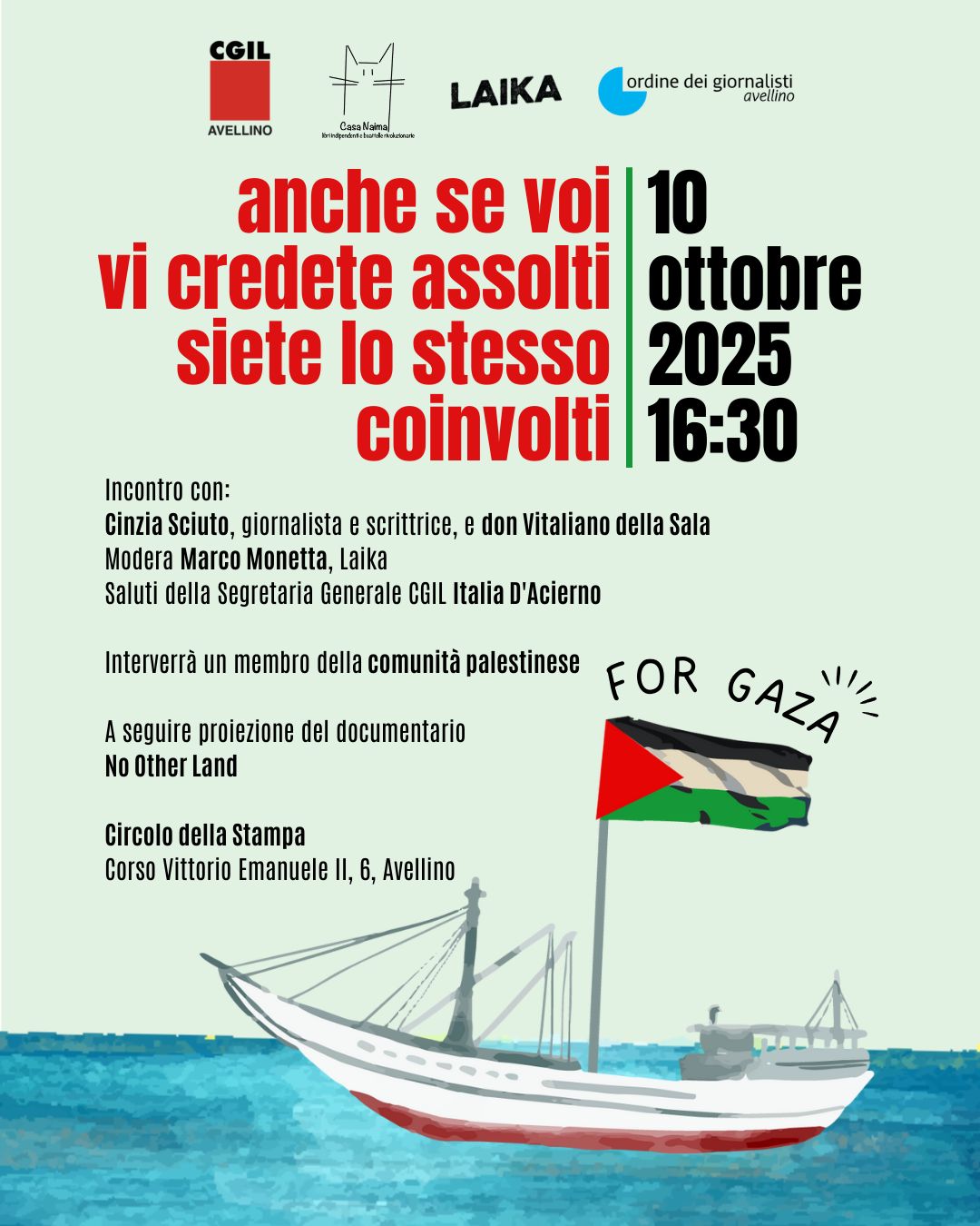 L’iniziativa di domani, venerdì 10 ottobre, “Anche se voi vi credete assolti, siete lo stesso coinvolti” in collaborazione con l’associazione Laika , Casa Naima e l’ordine dei giornalisti con la presenza di Cinzia Sciuto, giornalista e scrittrice e di Don Vitaliano Della Sala ancora una volta ci vedrà in un confronto che tiene insieme temi come la pace,i diritti, il lavoro e la società civile.