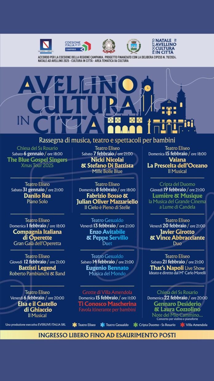 Avellino, 28 gennaio 2026 — Il Comune di Avellino, in linea con le strategie del Piano Cultura e Turismo 2024- 2025 approvato dalla Regione Campania con deliberazione di Giunta Regionale n. 616 del 14 novembre 2024, ha il piacere di presentare alla città un nuovo cartellone di eventi culturali e musicali denominato “Avellino Cultura in