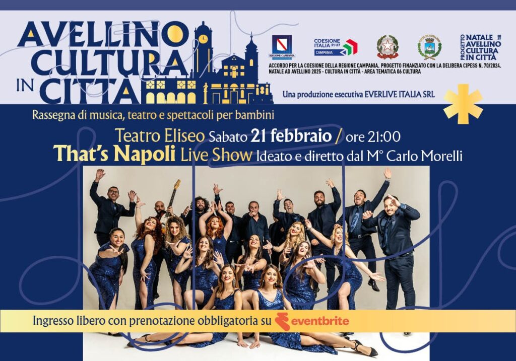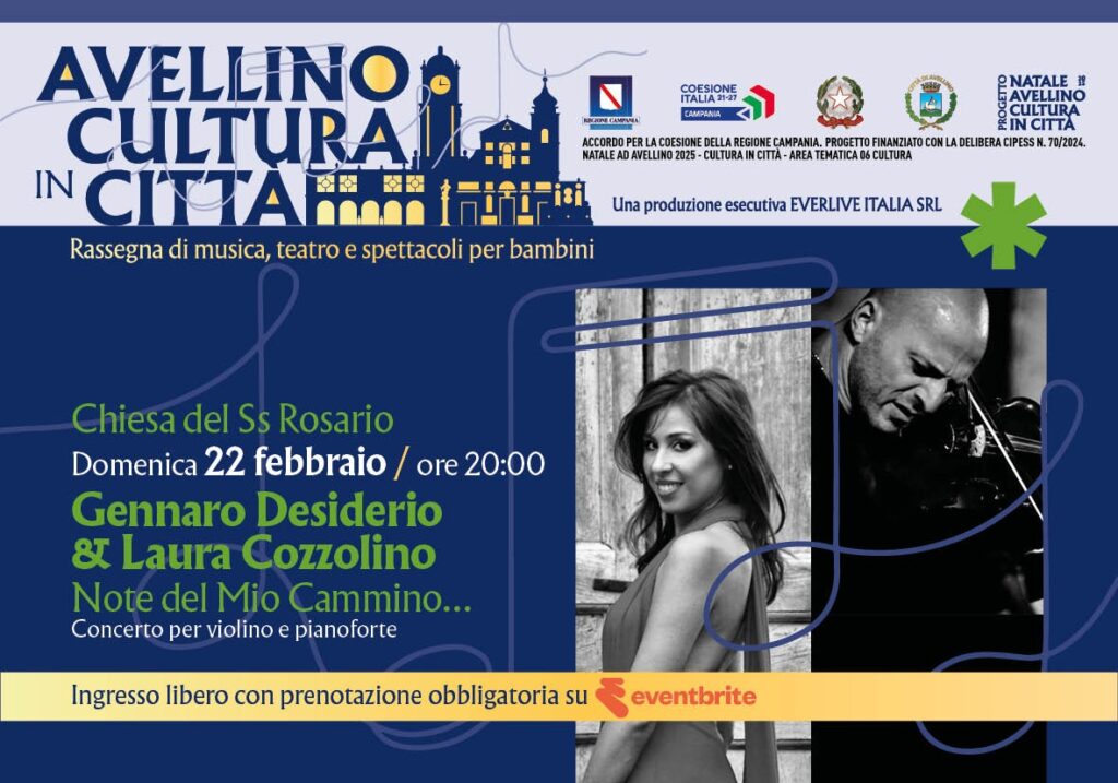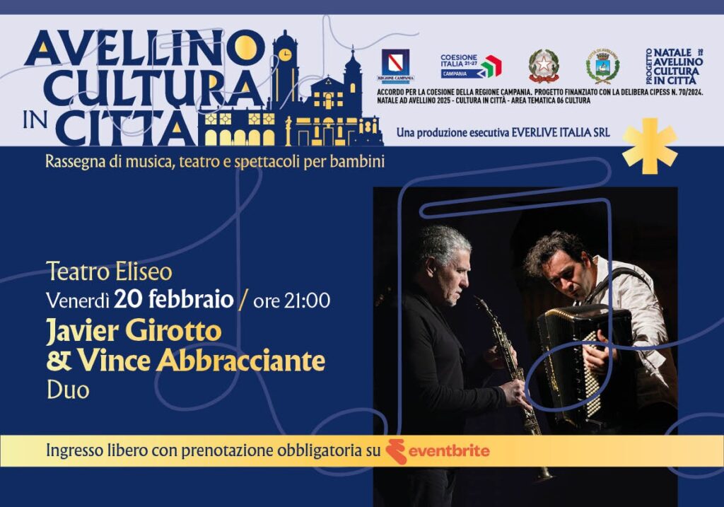 La prenotazione garantisce il posto fino all’orario di inizio spettacolo; eventuali posti liberi saranno successivamente assegnati al pubblico presente in sala senza prenotazione. CALENDARIO EVENTI DELLA SETTIMANA Giovedì 19 febbraio 2026 – ore 21:00 Duomo di Avellino“LUMIÈRE & MUSIQUE: LA MUSICA DEL GRANDE CINEMA A LUME DI CANDELA” Venerdì 20 febbraio 2026 – ore 21:00 Teatro Eliseo JAVIER GIROTTO & VINCE ABBRACCIANTE – DUO Sabato 21 febbraio 2026 – ore 21:00 Teatro Eliseo“THAT’S NAPOLI” LIVE SHOW Ideato e diretto dal M° Carlo MorelliDomenica 22 febbraio 2026 – ore 20:00 Chiesa del SS RosarioGENNARO DESIDERIO & Laura Cozzolino“NOTE DEL MIO CAMMINO…” Concerto per violino e pianoforte Eventuali aggiornamenti saranno comunicati esclusivamente attraverso i canali ufficiali della rassegna e del Comune di Avellino.