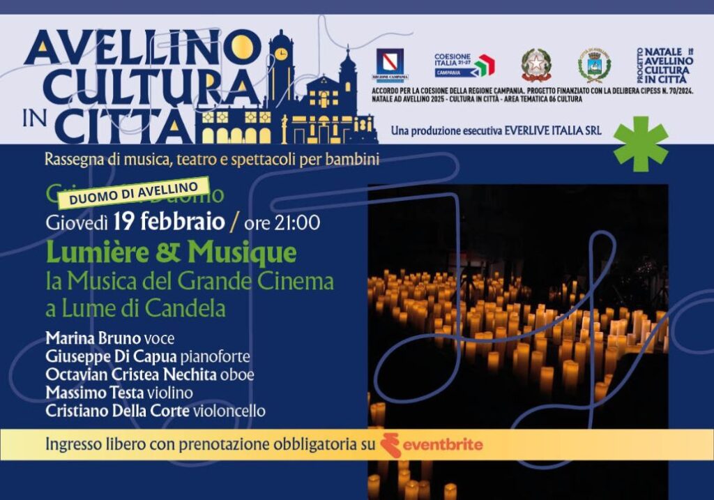 AVELLINO CULTURA IN CITTÀ – ULTIMA SETTIMANA DI EVENTI“LUMIÈRE & MUSIQUE” SI SPOSTA AL DUOMO DI AVELLINO ,- prenotazione obbligatoria per tutti gli eventi. Avellino, 17 febbraio 2026 In occasione degli ultimi appuntamenti della rassegna “Avellino Cultura in Città – Rassegna di musica, teatro e spettacoli per bambini”, organizzata dal Comune di Avellino con la produzione esecutiva di Everlive Italia Srl, si forniscono indicazioni aggiornate relative agli eventi in programma da giovedì 19 a domenica 22 febbraio 2026.Si comunica in particolare un cambio di location per lo spettacolo “Lumière & Musique: la Musica del Grande Cinema a Lume di Candela”, in programma giovedì 19 febbraio 2026 alle ore 21:00.