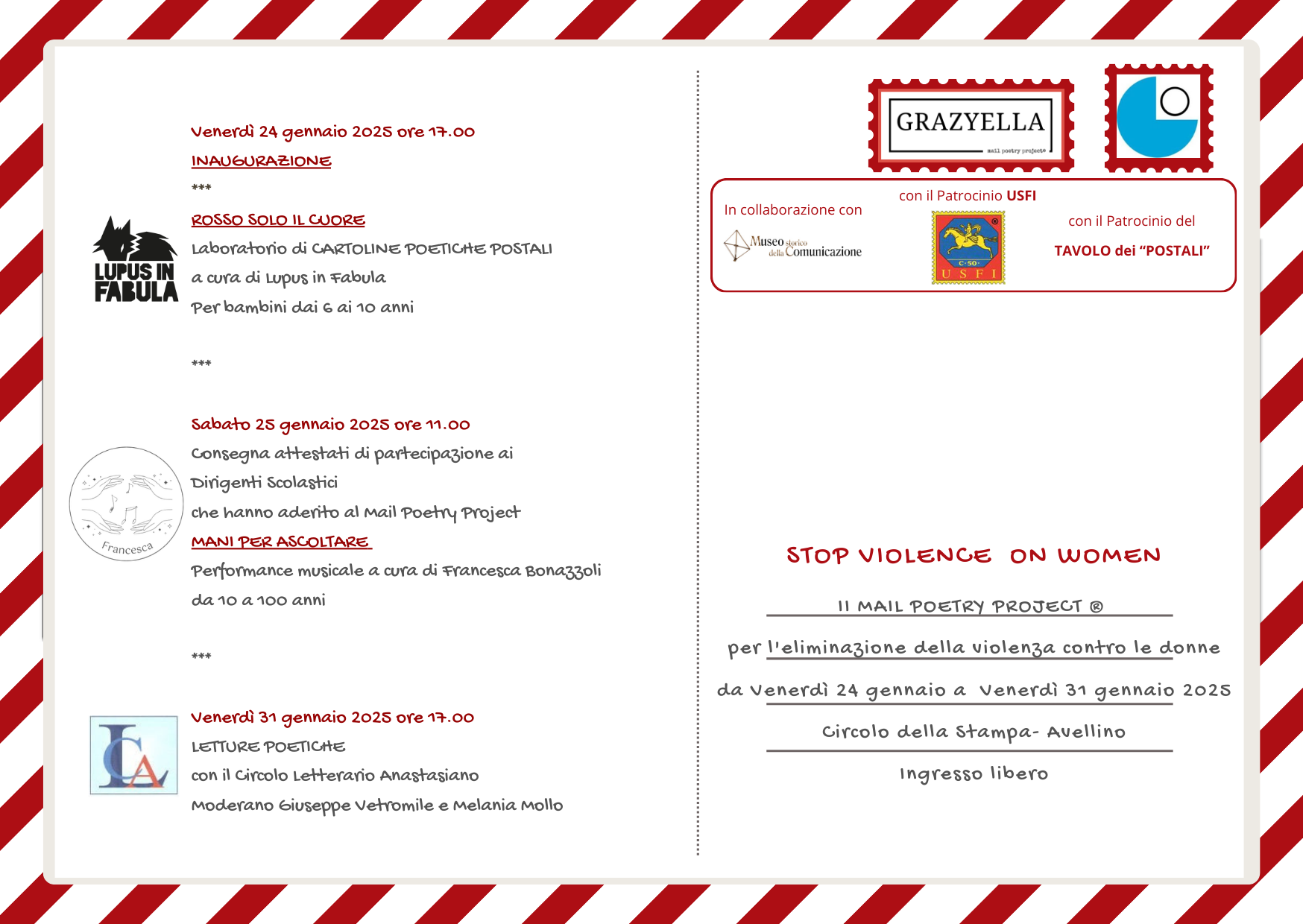 Avellino – mostra “Stop Violence Against Women”, parte della seconda edizione internazionale del Mail Poetry Project, un progetto artistico ideato da Grazyella (nome d’arte di Graziella di Grezia) e marchio registrato. L’evento si terrà dal 24 al 31 gennaio 2025 presso il Circolo della Stampa di Avellino.